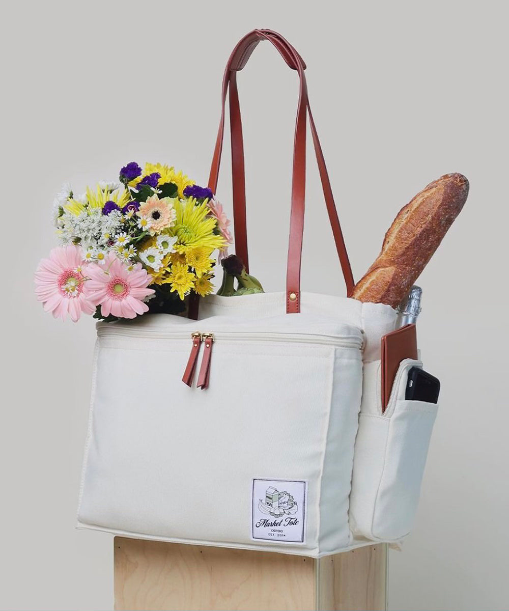 The market tote is back in stock. Made out of recycled plastic bottles, it's the perfect grocery shopping companion.